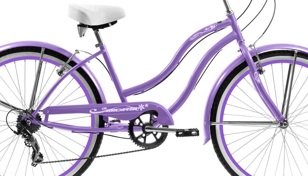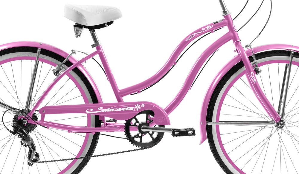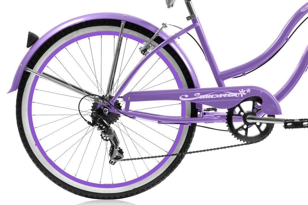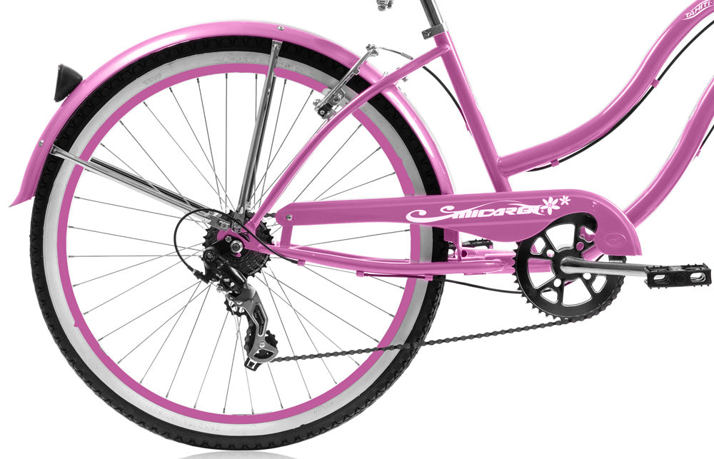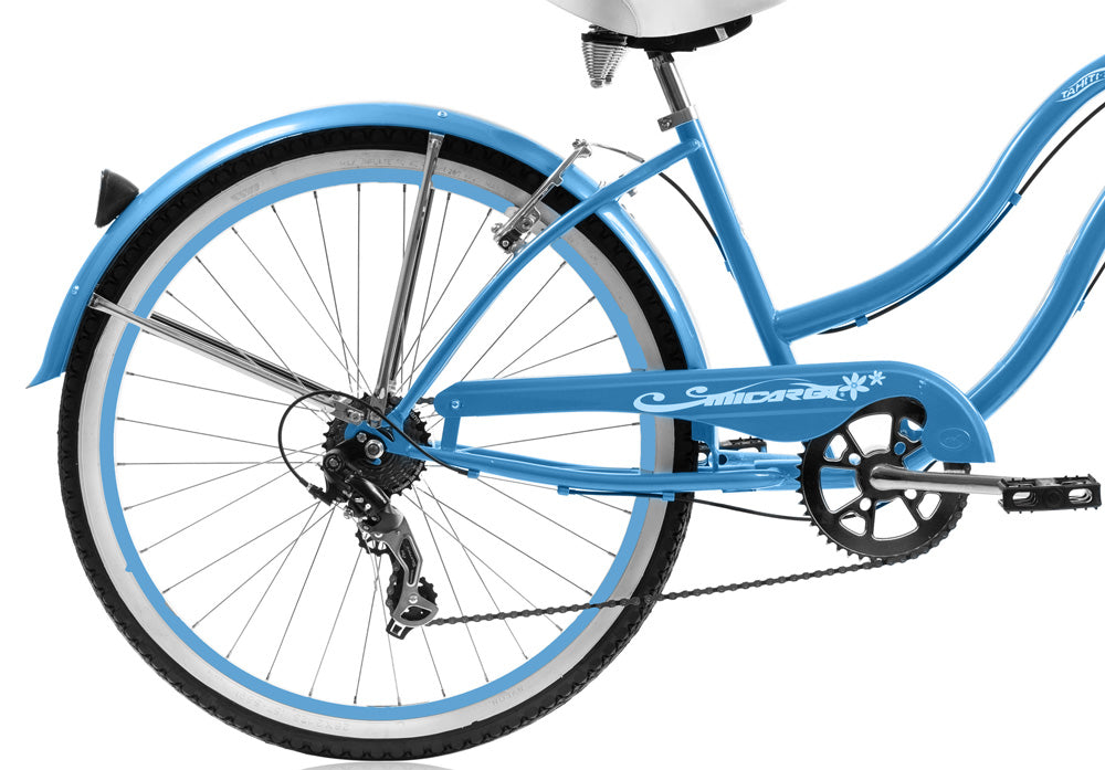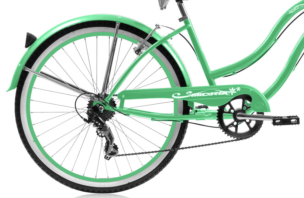 The Micargi Tahiti 24" 7 speed is a 24 inch version of our classic cantilever cruiser frame with all the style and pizzazz as its big brother. With a Shimano 7 speed drivetrain, nice comfy padded cruiser saddle and wide moon bars it's a pleasure to ride. With alloy rims and full fenders this beauty will stand out in a crowd. Hand actuated front and rear "V" brakes will bring you safely to a stop.