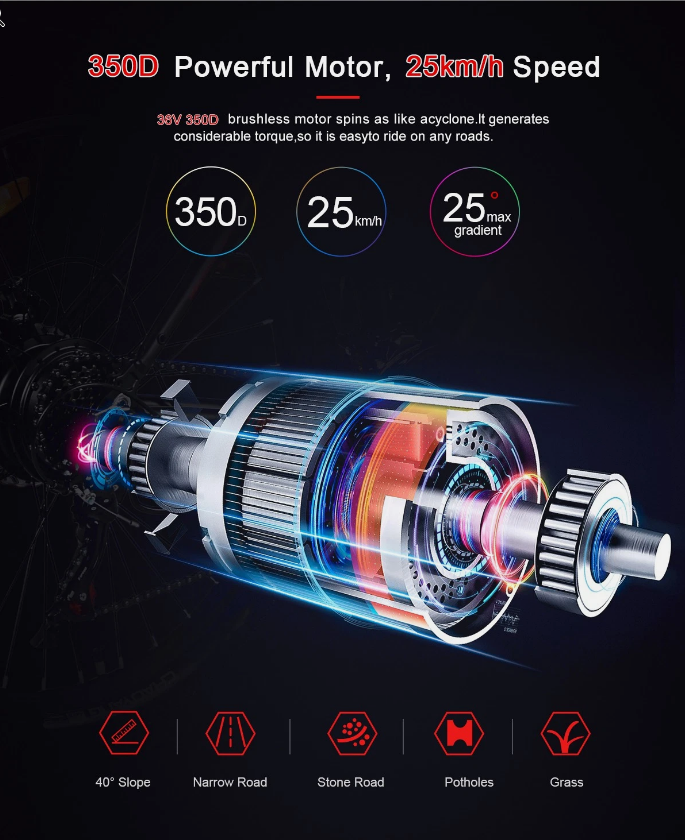 • Motor Power: 350 W Motor Type: Geared Hub Motor