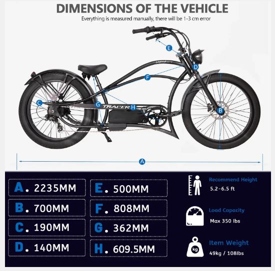 The Tracer Legend GT7, 26" Chopper Stretch E-Bike, stands out with its unique frame design and retro style. Whether in appearance or performance, the Tracer Legend GT7 meets all your expectations for a retro electric bike.