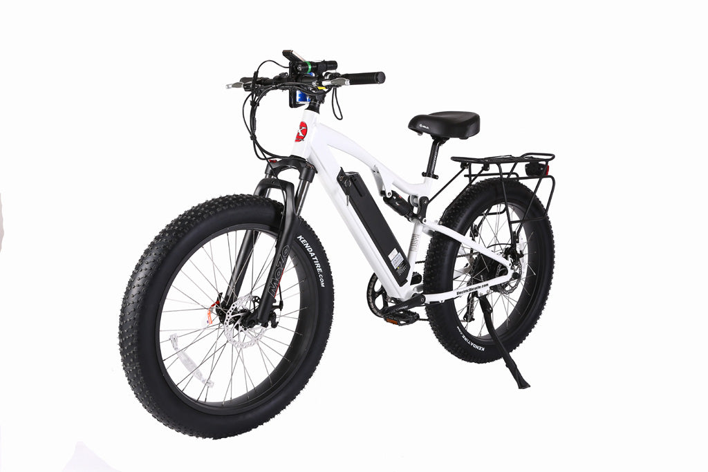 This bike features a lightweight, compact lithium LiPo4 48 volt 10.4 Ah integrated battery pack providing a considerable amount of power greater than our 24 volt or 36-volt models.  This bike comes with everything Aluminum - every bolt, every nut, every nipple, every spoke.  That means no rust!   The 100% hand welded lightweight aluminum frame bicycle has Atlus Shimano 9-Speed Gears & Shifting System, over-sized MOZO Front Hydraulic Suspension & KS Rear Shock Suspension, aluminum rims with quick release axle on the front and a waterproof quick disconnect on the rear and oversized Kenda 26 x 4.0 tires.