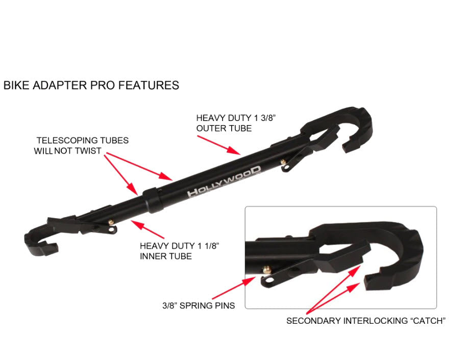 The Bike Adapter Pro is an artificial top tube that allows you to transport a variety of different bicycles with sloping top tubes, including but not limited to ladies, children’s, cargo, and full suspension bicycles on your bicycle rack. The telescoping bar will fit various size bicycles, and will not scratch your bike's finish. The adapter is heavy duty, non-twisting tubing, and has a secondary interlocking gate.