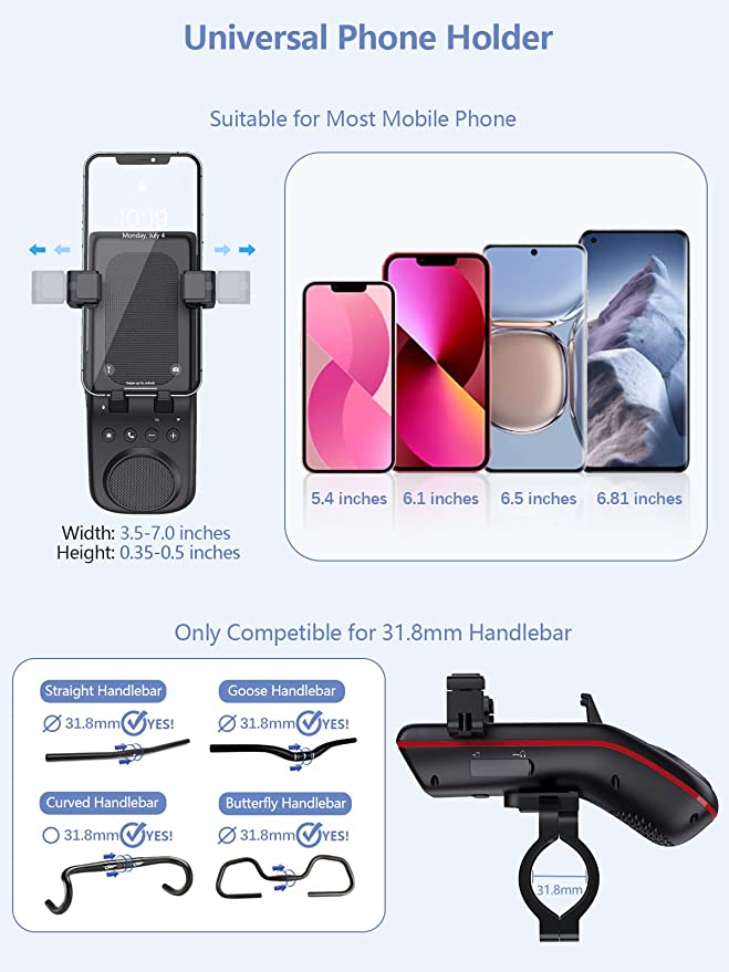 • Universal Phone Holder- The special clamping bracket mechanism of holder is suitable for different 31.8 mm handlebars to ensure the stability of the whole device. The width of the mobile phone holder can be adjusted from 3.5 to 7 inches, and the height can be adjusted from 0.35 to 0.5 inches. It can be used for most mobile phones, such as Apple, Samsung, Huawei, Xiaomi, OnePlus.