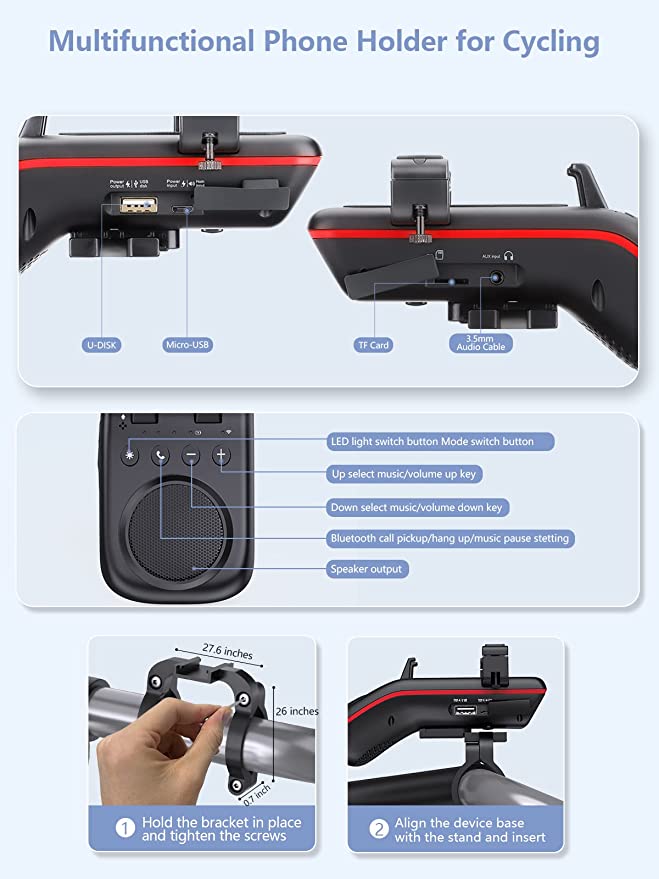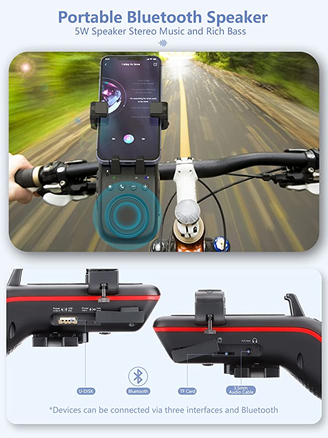• Portable Bluetooth Speaker- The multifunctional bicycle bluetooth 5.0 Speaker equipped with 5W speakers offering you stereo sound and rich bass. The bike speaker bluetooth supports a variety of music inputs (wired and wireless), including TF card, U-DISK or 3.5mm audio cable. Built-in microphone support you hand-free call while enjoying your cycling.