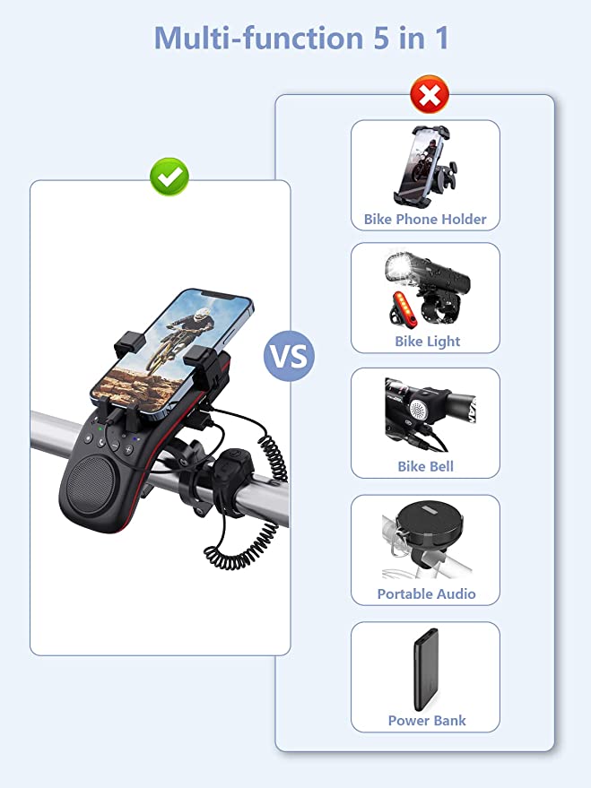 Weduda Bike Phone Holder, Portable Bluetooth Speaker with Microphone, LED Light and External Bicycle Bell, 5000mAh Power Bank, Multifunctional Bike Accessories for Adult Road & Mountain Cycling